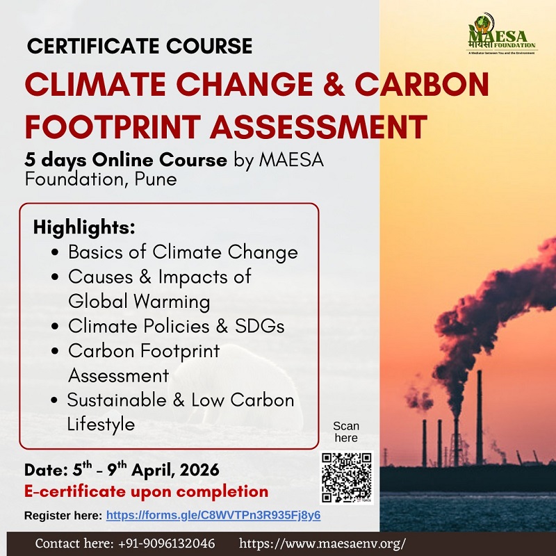 Participants who successfully complete the course will receive a Certificate in Climate Change and Carbon Footprint Assessment issued by MAESA FOUNDATION, Pune.